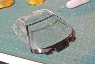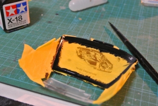 フロントウィンドウのクリアパーツに付属のマスキングシールを貼って裏側から黒で塗る。この前作ったシビックフェリオはエアブラシを使用したけど、今回は筆で塗っている。塗料はタミヤエナメルのセミグロスブラック。