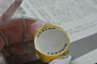 下地が乾くのを待つ間に、タイヤにダンロップのロゴを塗装する。エッチングパーツとテープでマスキングし、エアブラシでイエローを吹き付ける。
