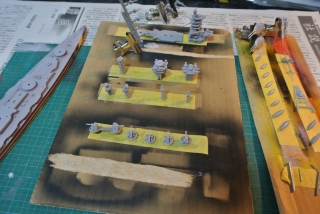 艦橋や砲塔を軍艦色で塗装。使用した塗料はクレオスの軍艦色(2)。