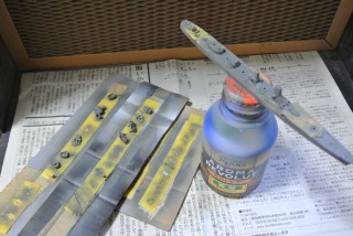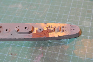 まずは前部と後部甲板にモデルカステンのリノリウム色を吹いた。タミヤの色指定には甲板の塗り分けなんかなくてグレー一色で塗るように指示されているけど、他社のキットなどを見ると塗り分け指定があるのでそれを参考にしてみた。