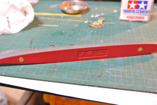 ダイキャストの艦底パーツと船体をねじ止めした。金属のダイキャストはプラスチック用接着剤ではくっつかないので注意。