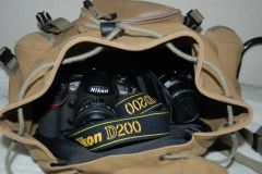 ニコンキャンバスリュックはドンケF3と同じくキャンバス生地でできているが、こちらには蓋付きのクッションボックスが入っていて機材の保護性は確保されている。このボックスがあるため、2気室のリュックみたいになっているが、リュック自体の開口部が上部にしかないので、ボックスから物を取り出すには、上に置いた物を一旦出さなければならない。だから、使用頻度の低いレンズやアクセサリーをボックスに入れ、すぐに使いたいものをボックスの上に置くようにしたほうがいいだろう。。